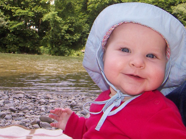 Mit Mama und Papa war ich drei Wochen lang mit dem Wohnmobil im Urlaub: Hier bin ich in am Strand der Isar in meiner Geburtsstadt München.