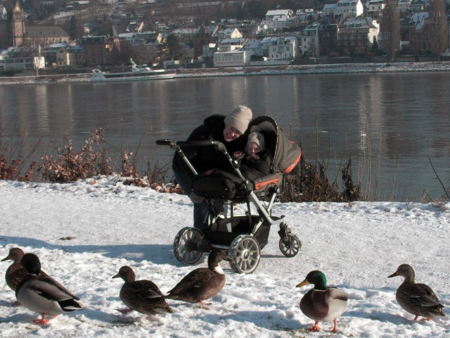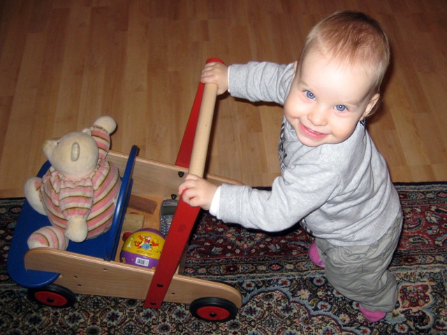 In den letzten zwei Monaten ist sehr viel passiert. Erstmal sind wir nach Koblenz umgezogen. Auf dem oberen Foto bin ich mit Mama am Rhein beim Entchen anschaun. Tagsüber geh ich jetzt immer zu Tante Anna, wo auch andere Kinder sind. Das finde ich toll. Dann hatte ich meinen ersten Geburtstag. Und die Omas und Opa kamen zu Besuch und es war Weihnachten. Kurz nach Weihnachten hab ich dann ganz viele neue Sachen entdeckt: Ich kann jetzt sagen, dass ich "essen" will, vor allem "Gurke". Sonst probiere ich viel zu essen aus, zum Beispiel Datteln, geschmierte Stullen und Nudeln. Morgens nehme ich meine Jacke und sage Papa, dass ich zu "Anna" will. Warum ich da am Wochenende nicht hingehe, hab ich noch nicht verstanden. Stehen kann ich jetzt schon gut, aber laufen mag ich noch nicht so. Nur mit dem "Taxi", das ihr auf dem Foto unten seht, kann ich es schon sehr gut. |