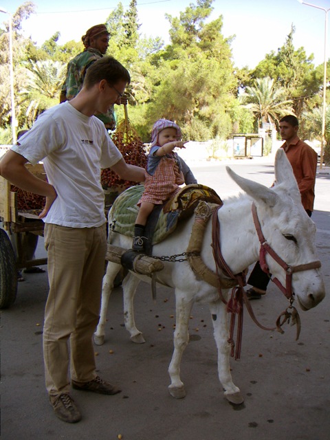 Urlaub in Syrien: Eselchen reiten trau ich mich, das Kamel schau ich lieber vom weiten an. Das Beste im Urlaub ist übrigens das Essen: Oliven schon zum Frühstück, Datteln, Reis...