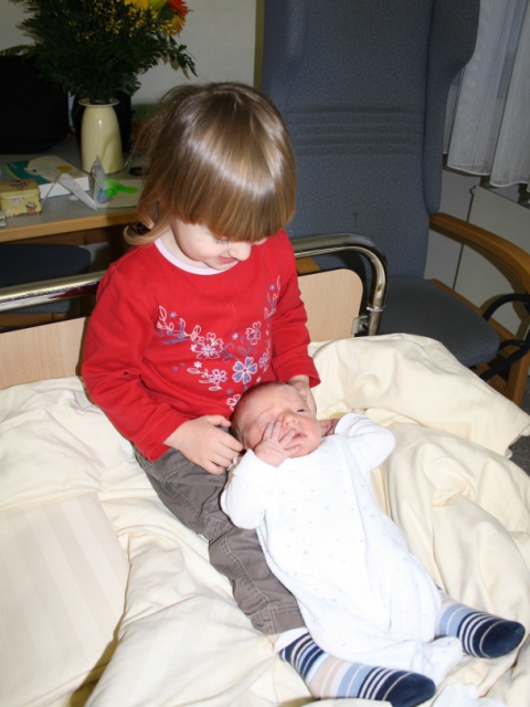 Ich habe ein Brüderchen! Hier besuche ich Johann im Krankenhaus. Ihn im Bettchen durch die Gänge schieben macht mir großen Spaß. Hier noch in Bild von Johann, ist er nicht süß?